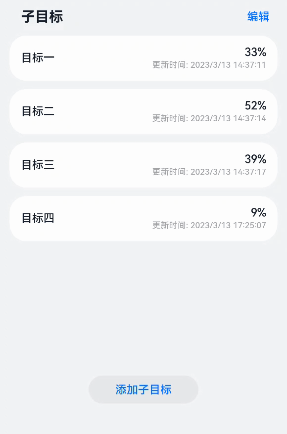 如图4所示,在目标管理应用中,当用户点击子目标列表的“编辑”文本,列表进入编辑模式,点击取消,列表退出编辑模式。