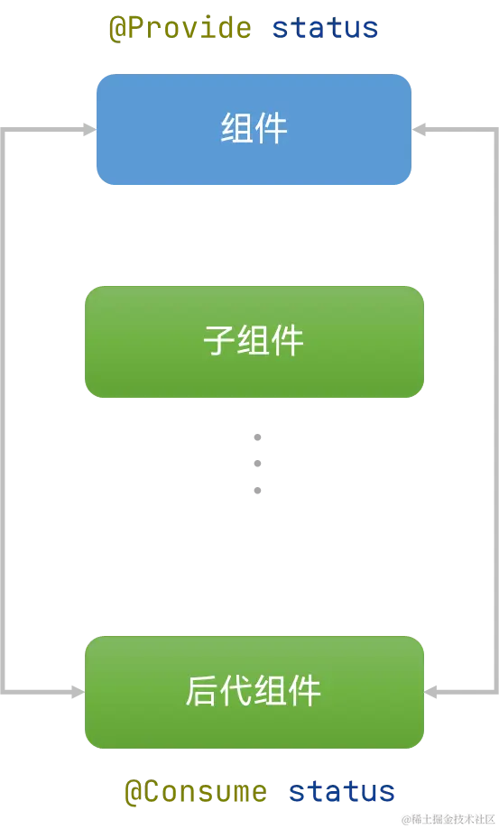 跨组件层级双向同步状态是指@Provide修饰的状态变量自动对提供者组件的所有后代组件可用,后代组件通过使用@Consume装饰的变量来获得对提供的状态变量的访问。@Provide作为数据的提供方,可以更新其子孙节点的数据,并触发页面渲染。@Consume在感知到@Provide数据的更新后,会触发当前自定义组件的重新渲染。