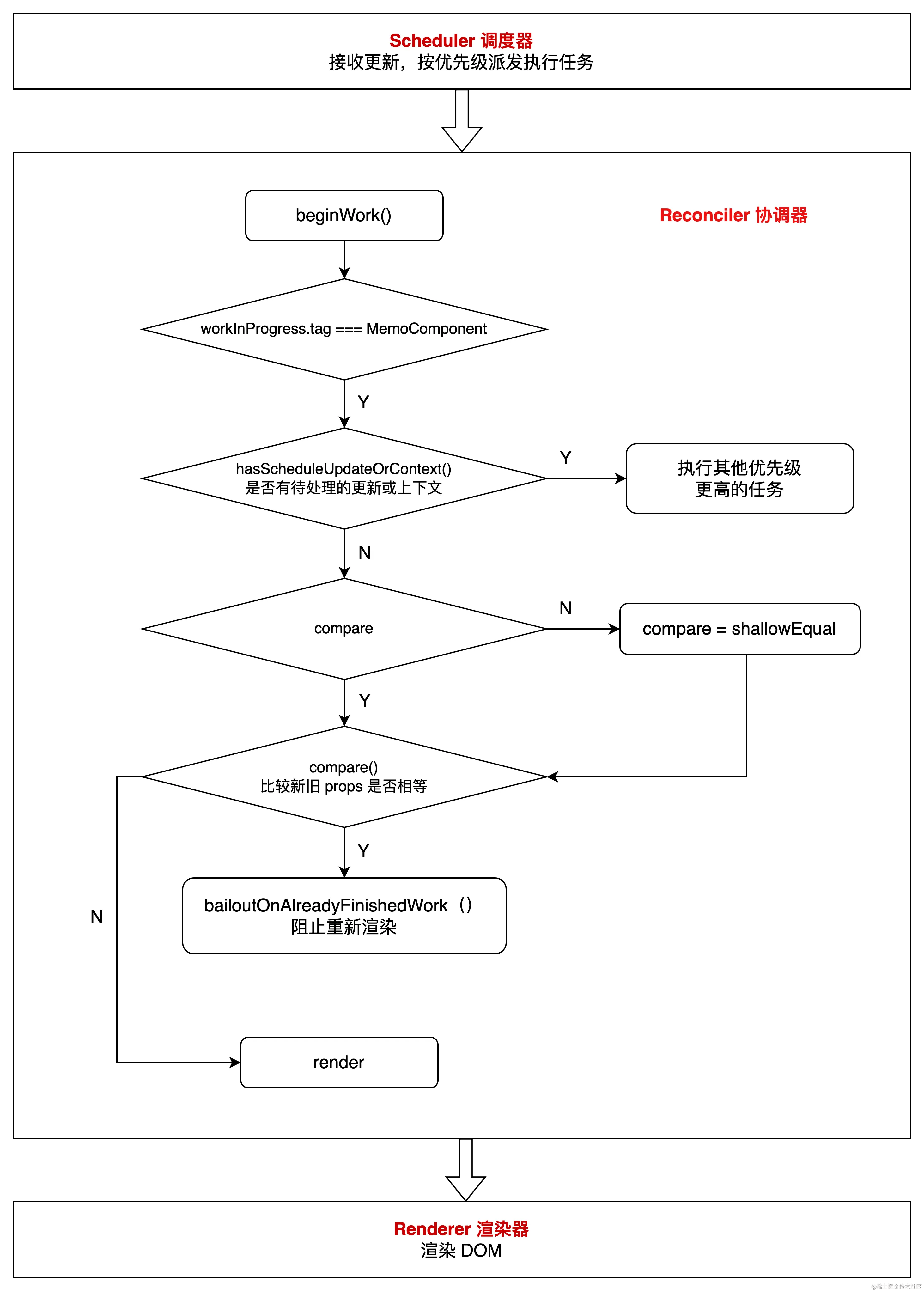 在这个流程中,在当前组件对应 fiber 节点的 tag 为 MemoComponent 且 没有其他更高优先级任务时,react.memo 会在新的 props 到达时,比较新旧 props 是否相等。如果相等,则不会重新渲染组件,直接返回之前的渲染结果。如果不相等,则重新执行渲染逻辑,更新组件的 DOM。这样可以避免不必要的组件重新渲染,提高性能。