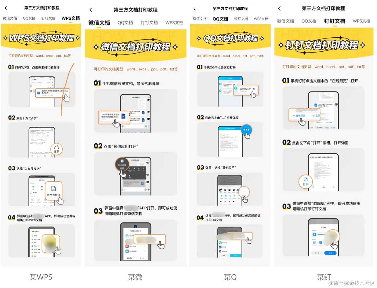 当前市面上几乎所有的打印软件都支持WPS/微信/QQ/钉钉的文档进行打印,但是其实现方案均为需要引导用户进入对应的app选择分享或发送到打印app进行打印,其根本原因在于打印app无法直接获取到WPS/微信/QQ/钉钉等应用内的文档列表,且由于现有的android11之后的文件架构,更是无法获取到应用私有文件目录下的文档