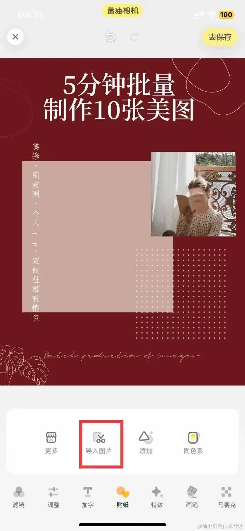 ⑤ 点击贴纸-导入图片,选择已经马赛克及裁剪的图片,选择合适大小。