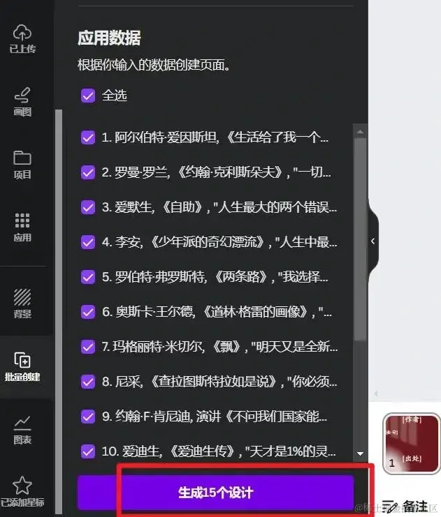 点击生成15个设计。一开始建议先把文本颜色、位置、大小排列整齐,尝试先生成2个看看效果。