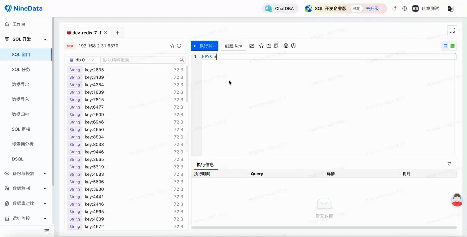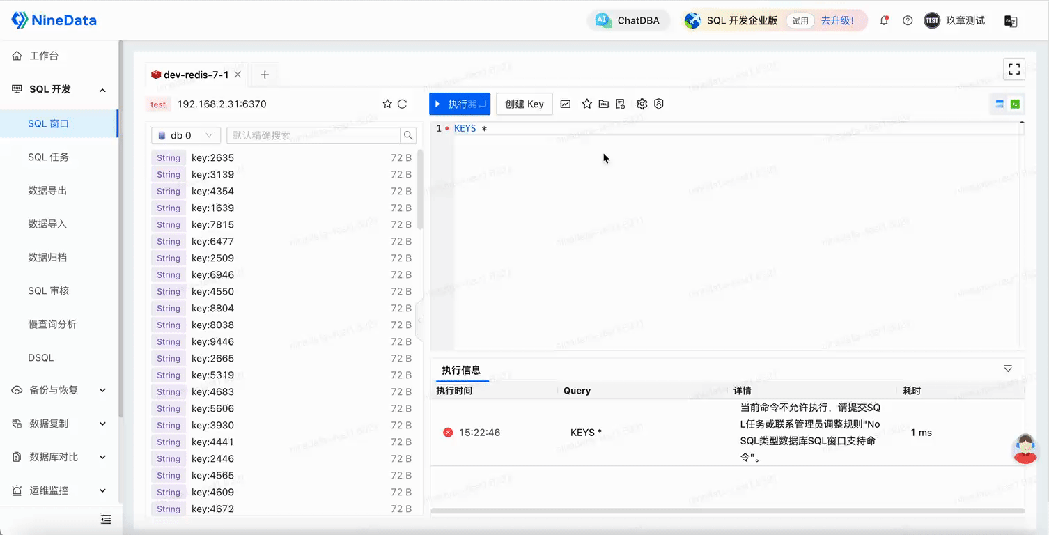 到 NineData SQL 窗口中执行 KEYS * 进行验证,发现不允许执行,至此已达到禁用危险命令的目的。
