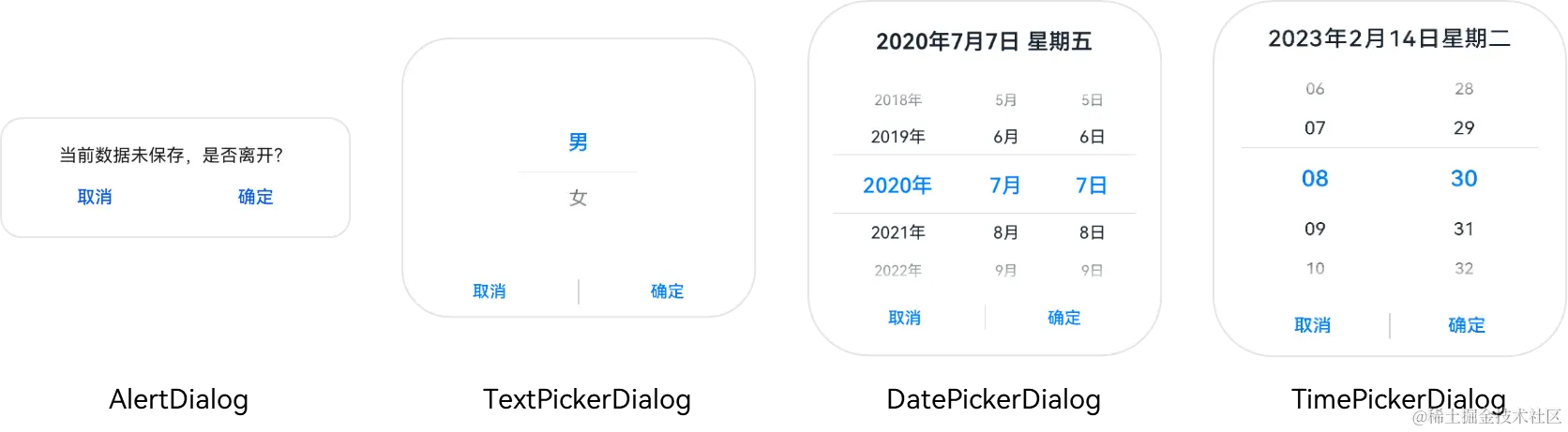 - 选择类:包括文本选择弹窗TextPickerDialog 、日期滑动选择弹窗DatePickerDialog、时间滑动选择弹窗TimePickerDialog等。