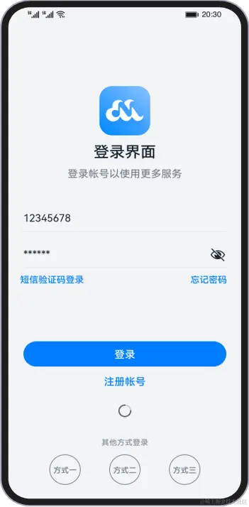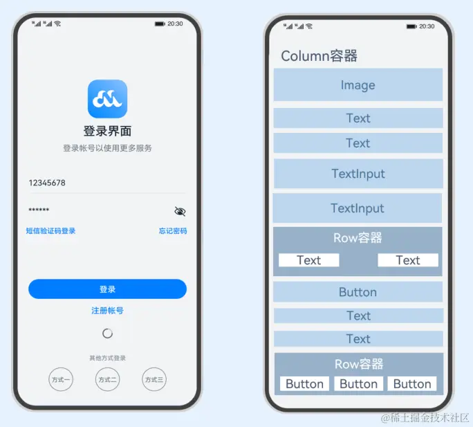 组件根据功能可以分为以下五大类:基础组件、容器组件、媒体组件、绘制组件、画布组件。其中基础组件是视图层的基本组成单元,包括Text、Image、TextInput、Button、LoadingProgress等,例如下面这个常用的登录界面就是由这些基础组件组合而成。