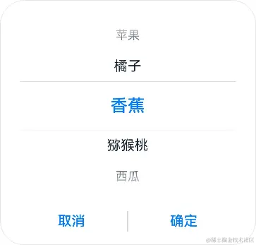 @Entry@Componentstruct TextPickerDialogDemo { @State select: number = 2; private fruits: string[] = ['苹果', '橘子', '香蕉', '猕猴桃', '西瓜'];