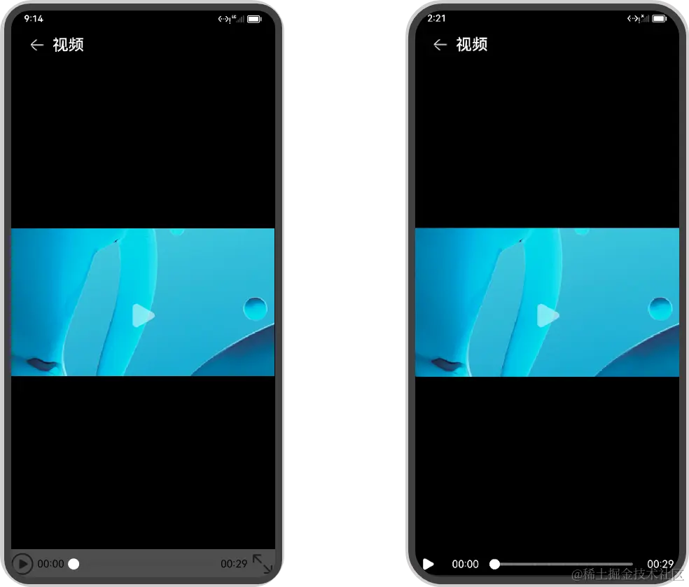 Video组件的原生控制器样式相对固定,当我们对页面的布局色调的一致性有所要求,或者在拖动进度条的同时需要显示其百分比进度时,原生控制器就无法满足需要了。如下图右侧的效果需要使用自定义控制器实现,接下来我们看一下自定义控制器的组成。