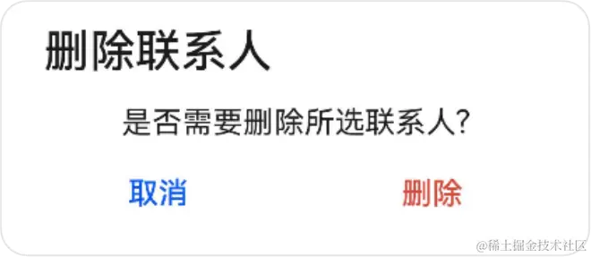 在我们日常使用应用的时候,可能会进行一些敏感的操作,比如删除联系人,这时候我们给应用添加弹窗来提示用户是否需要执行该操作,如下图所示: