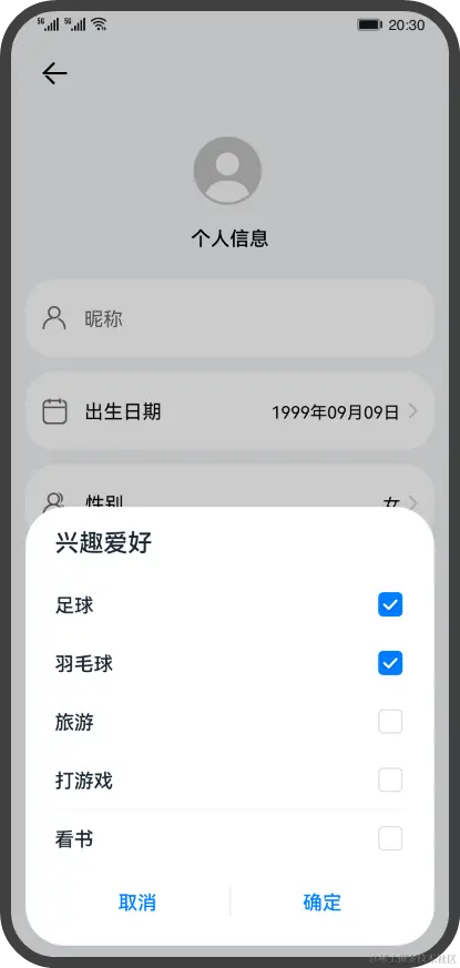 自定义弹窗的使用更加灵活,适用于更多的业务场景,在自定义弹窗中您可以自定义弹窗内容,构建更加丰富的弹窗界面。自定义弹窗的界面可以通过装饰器@CustomDialog定义的组件来实现,然后结合CustomDialogController来控制自定义弹窗的显示和隐藏。下面我们通过一个兴趣爱好的选择框来介绍自定义弹窗的使用。