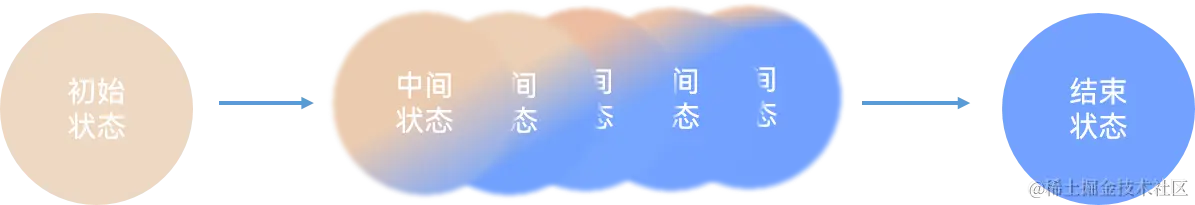 简单来说,属性动画是组件的通用属性发生改变时而产生的属性渐变效果。如下图所示,其原理是,当组件的通用属性发生改变时,组件状态由初始状态逐渐变为结束状态的过程中,会创建多个连续的中间状态,逐帧播放后,就会形成属性渐变效果,从而形成动画。
