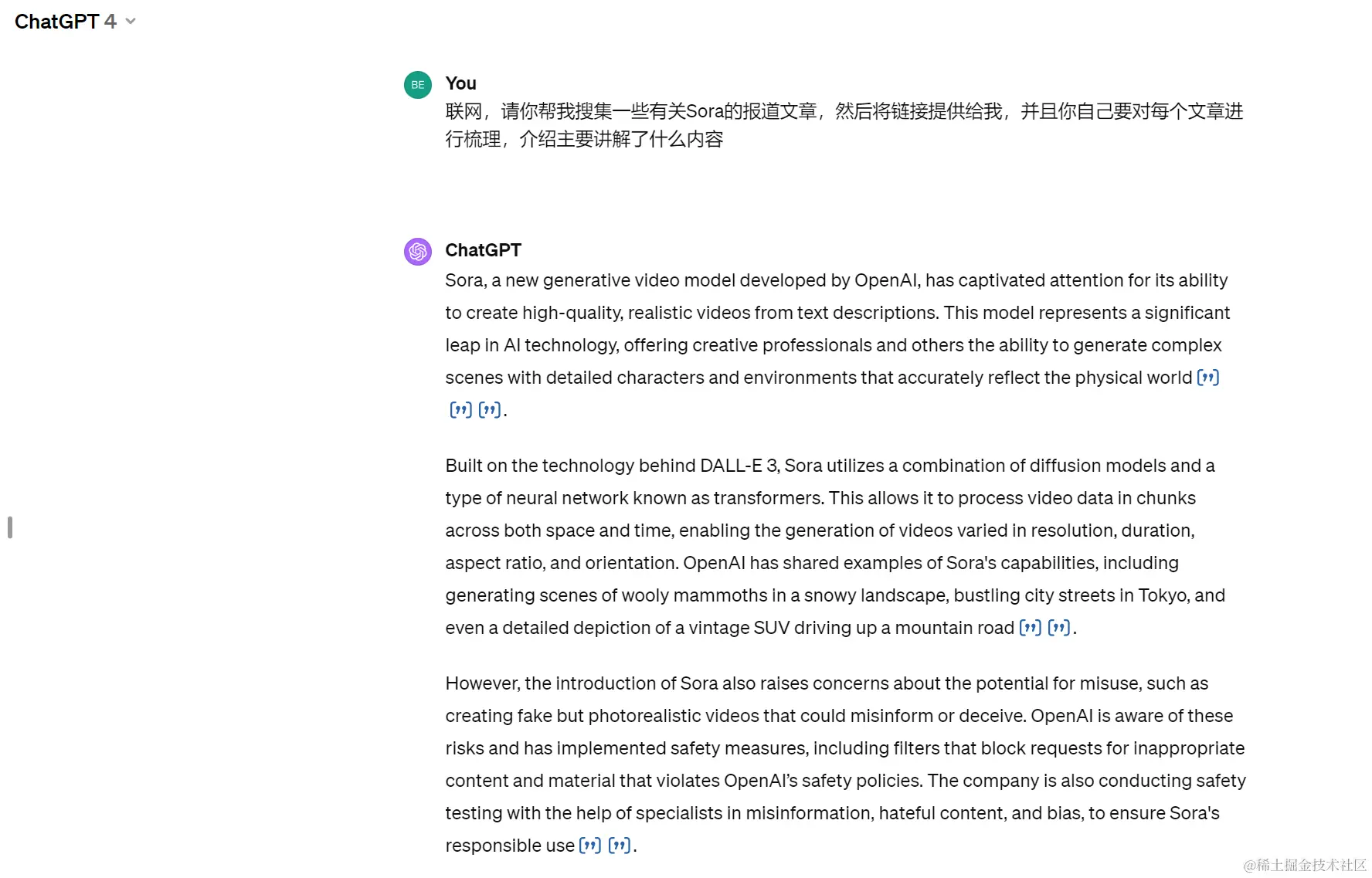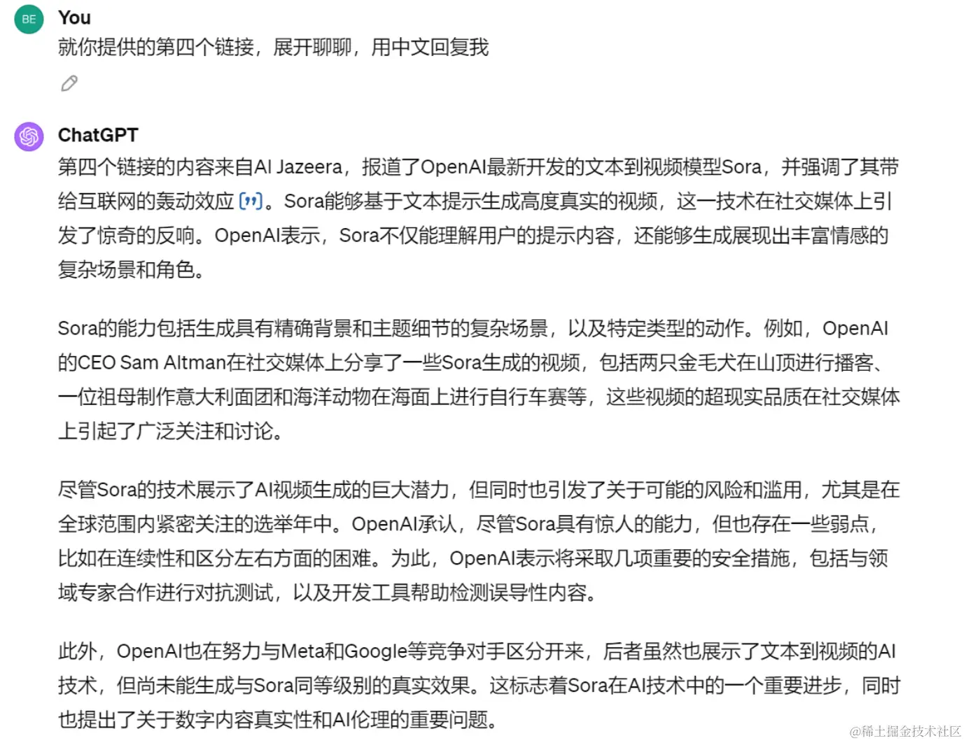 呃,GPT-4,确实也给我提供了几个链接,但是又两个是openai的官网,只有一篇是有关sora的国外报道,并且反馈给我们的是英文。下面就单一链接,具体提问一下看看