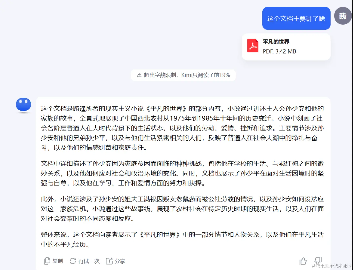 这里我上传了一个100万字的长篇小说《平凡的世界》,它回复我只能解读前19%,也就是说确实是达到20万字的上下文水平了。并且最重要的是,它不像Cluade3 GPT-4那样显示无法解读,kimi会解读它能够解读的部分,这个功能是真的从超长文本的角度来进行的考量。