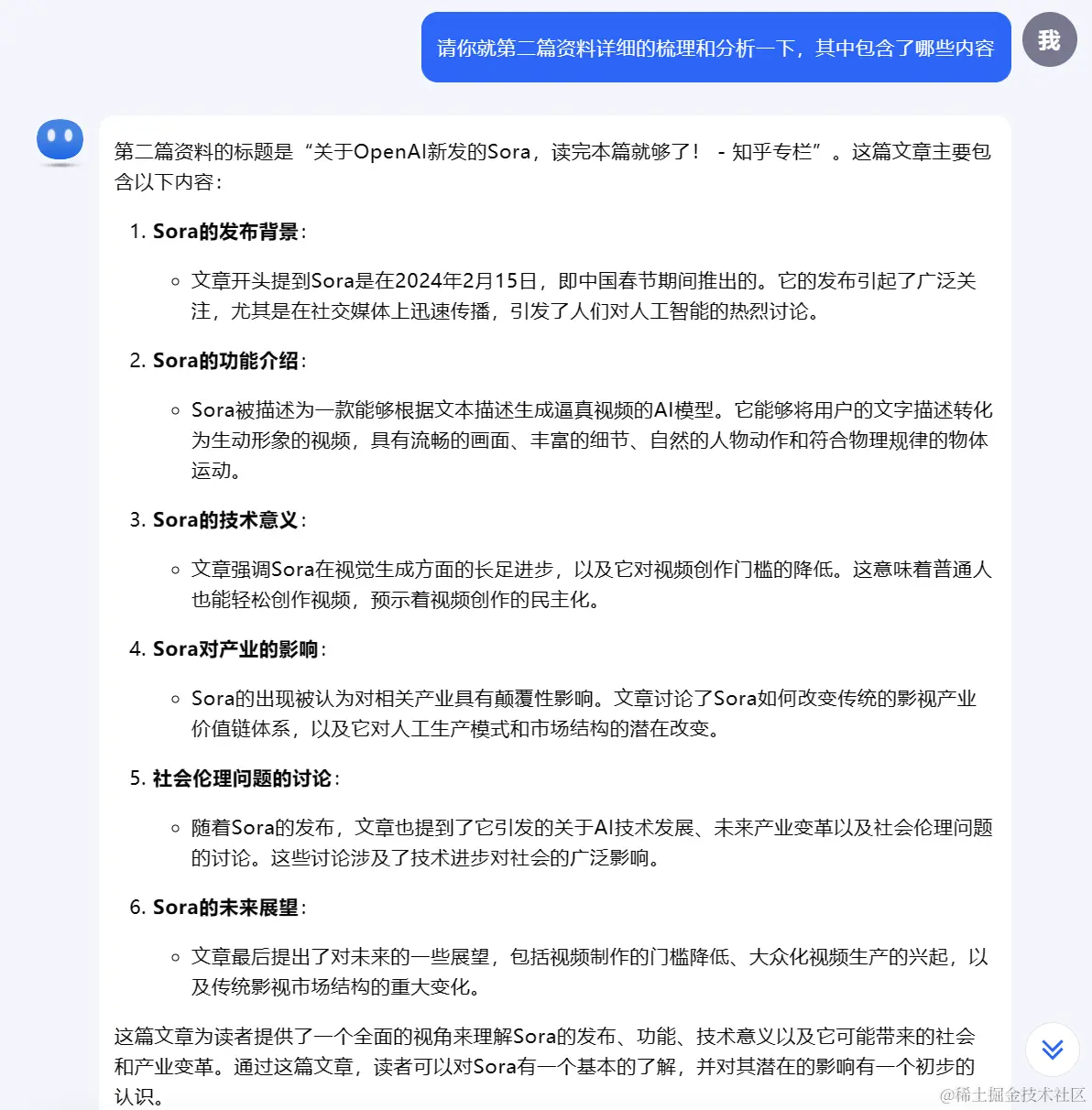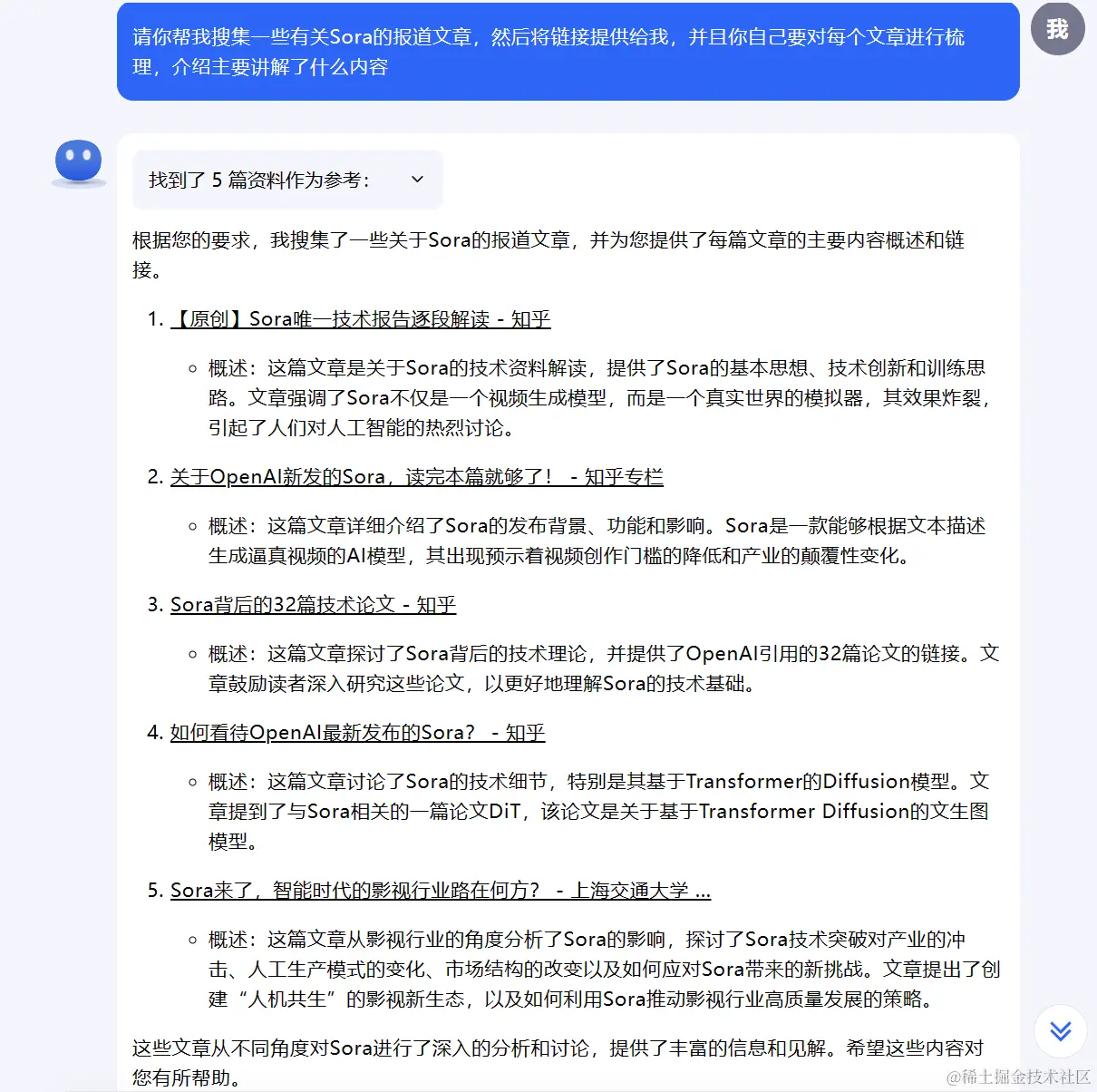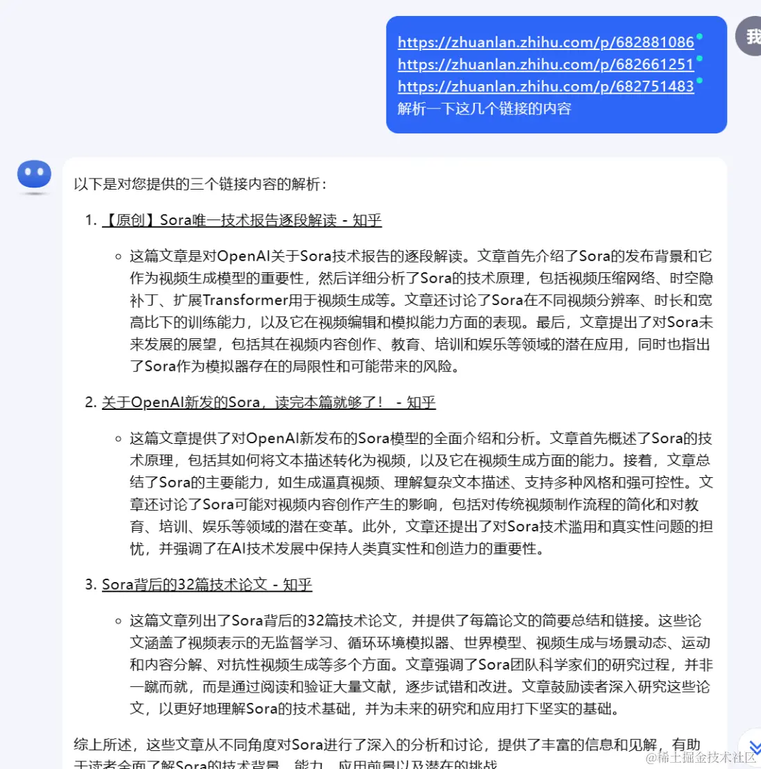 在这部分功能测试的时候,我又把最开始它帮我们收集的有关Sora的文章,链接copy了下来发给了它, 来进行一个论证