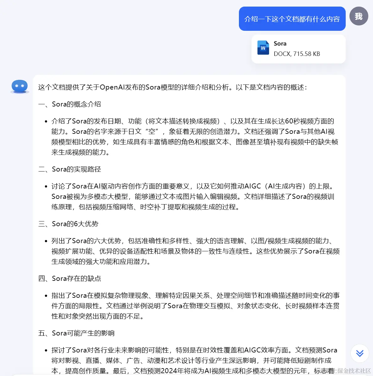 这里我上传了一个我自己写的Sora的介绍文档,发现它总结出来的内容确实很全面,基本上没有什么问题。