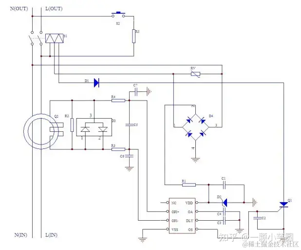 如上图,D55125ADA 漏电保护器专用电路用于检测火线和零线上的漏电信号。当有漏电信号产生时,零电流互感器(ZCT)检测到电信号,其次级线圈输出作为漏电保护器芯片的输入,漏电信号可以是直流、AC 型和 A 型(包括 0°、90°和 135°漏电信号)。当漏电流的 RMS 值大于漏电保护器规定的额定电流(rms)时,漏电保护器输出 OS 引脚产生动作电平,该电平脉宽持续 30ms 左右。