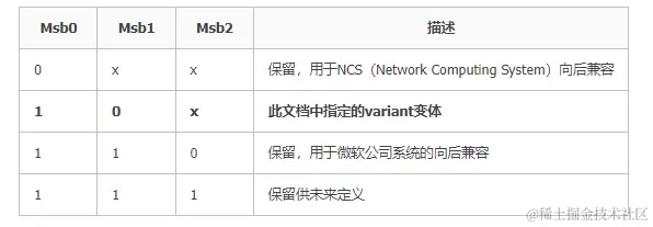 类型(变体)的标志符可以是 2位也可是3位,本文围绕的的是 RFC4122: A Universally Unique IDentifier (UUID) URN Namespace 类型(变体), 即上面表格的第二行,其第三高位 为 x,表示该值并无意义,所以该版本只需要10 即可。