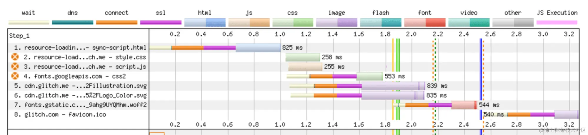 在页面开始渲染之前,需要下载并处理的所有阻塞资源,在瀑布流中使用深绿色实线表示。