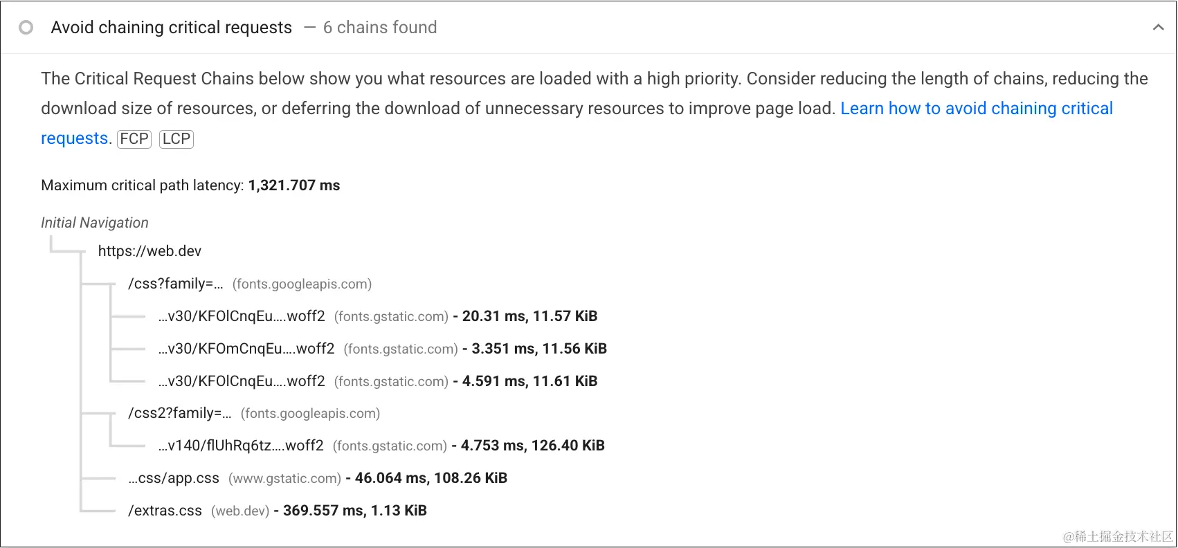 对于更复杂的站点,Lighthouse 还在单独的审核(audit)中突出显示了关键请求链: