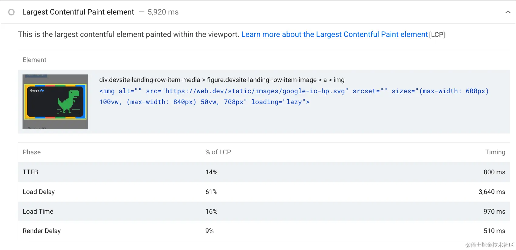 许多工具可以识别 LCP 元素 及其渲染时间。除了 LCP 元素之外,Lighthouse 还将帮助识别 LCP 阶段 以及每个阶段所花费的时间,帮助你了解如何去优化及最佳实践。
