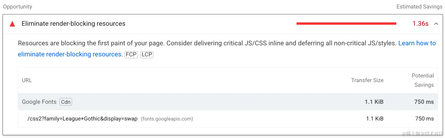 Lighthouse 还以更巧妙的方式突出显示阻塞渲染的资源,只有当这个资源会实际延迟页面渲染时才突出显示。这既能避免误报,也能最大限度地减少渲染阻塞。下面是使用 Lighthouse 运行与前面 WebPageTest 相同 URL 时的结果。Lighthouse 将其中一个样式表文件识别为阻塞渲染的资源。