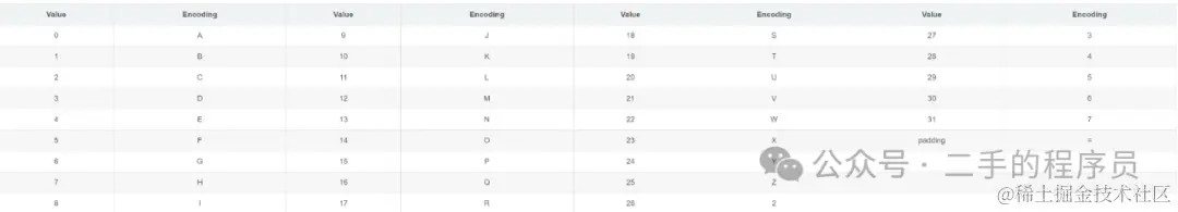 了解了BASE64的原理,那BASE32也就好理解了,它就是使用32个可见字符做编码表,然后是5个bit作为一组,也有填充。