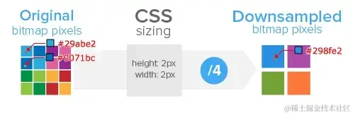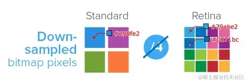 对于 dpr=2 的 retina 屏幕而言,1 个位图像素对应于 4 个物理像素,由于单个位图像素不可以再进一步分割,所以只能就近取色,从而导致图片模糊(注意上述的几个颜色值)