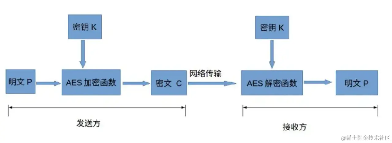 AES 算法为最常见的对称加密算法(微信小程序加密传输就是用这个加密算法的)。对称加密算法也就是加密和解密用相同的密钥,具体的加密流程如下: