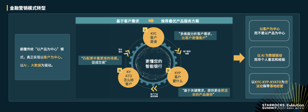 在这个过程中,我们坚持以大数据和 AI 驱动决策,真正转向以客户为中心,而非以产品为中心的销售模式。我们强调数据驱动的运营,而非依赖前线销售人员的个人经验,并通过 KYC、KYP 和 KYATO 的方法论实施整个经营策略。这一转变旨在提升服务质量和客户满意度,推动金融营销的新时代。