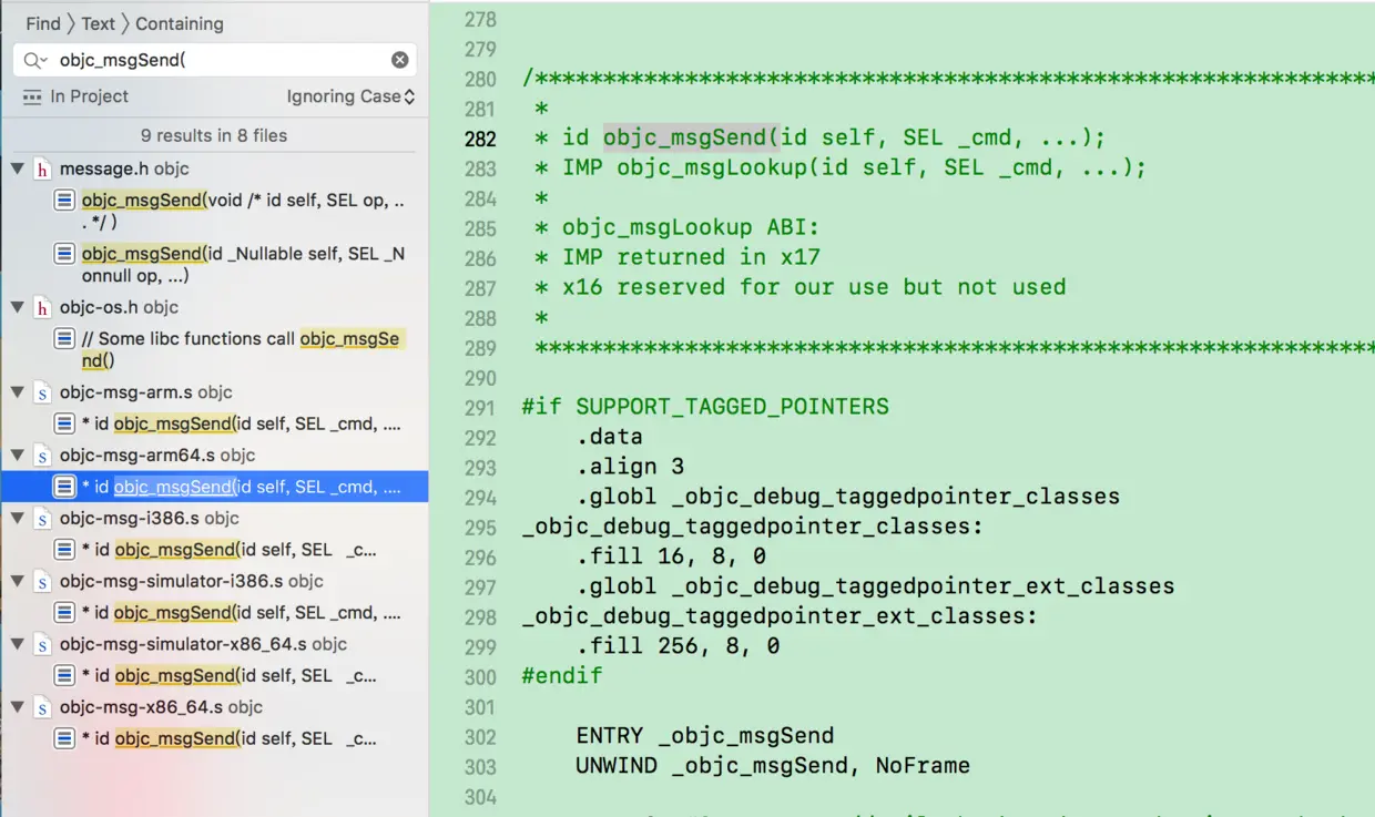 打开 Runtime 源码,全局搜索objc_msgSend(,找到objc-msg-arm64.s这个类