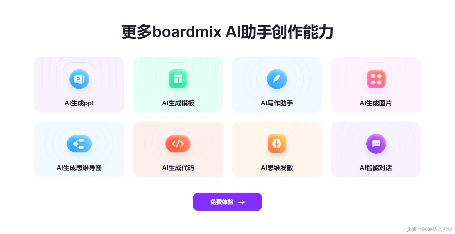 最后值得一提的是,boardmix AI 不仅是一款 AI 绘图工具,它更是新一代的 AIGC 办公工具,提供多项 AIGC 创作能力,包括但不限于:AI 生成 PPT、AI 生成模板、AI 写作、AI 生成思维导图、AI 生成代码、AI 思维发散(AI 生成脑暴创意点)、AI 智能对话等,在一款软件中畅享多款时下流行的 AI 工具,为工作、学习和生活持续赋能。