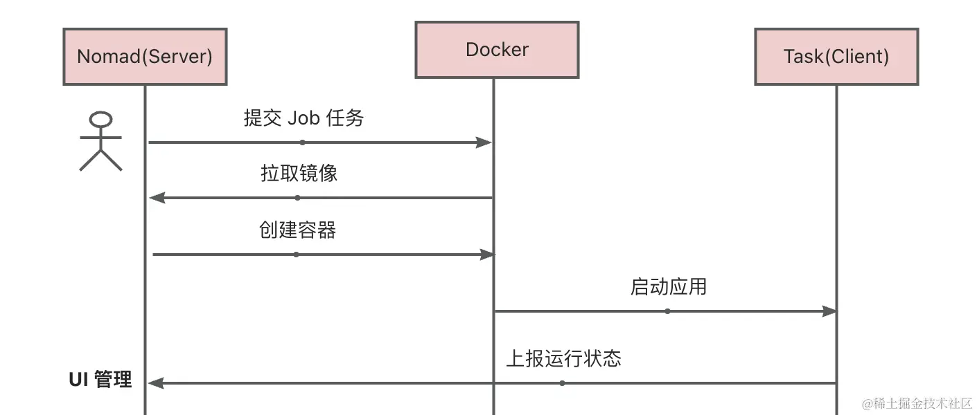 流程比较简单,我们通过一个 Nomad 集群 Docker 调度时序图进行说明,具体如下: