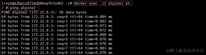 在 "alpine1" 容器中,使用 ping 命令来访问 "alpine2" 容器