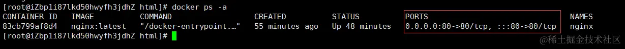 当使用 docker ps -a 我们可以看到主机的80端口映射到了docker的80端口上: