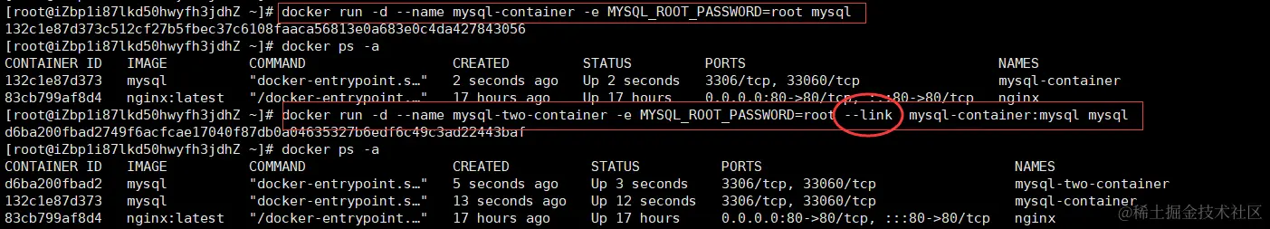 $ docker run -d --name mysql-two-container -e MYSQL_ROOT_PASSWORD=root --link mysql-container:mysql mysql