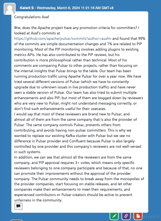 他觉得本次提名成为 Committer 的大部分贡献都是一些文档相关的内容,还有少部分是与监控相关的提案。 他们团队使用 Pulsar 有一段时间了,但目前还未发现稳定的 Pulsar 版本;大部分的 Review 都是来自同一公司(streamnative)。 看起来是整个 Pulsar 项目由某一家公司控制了,他们当初选择从 Kafka 切换到 Pulsar 就是因为 Kafka 由 Confluent 控制,才选择一个更加开放的社区。
