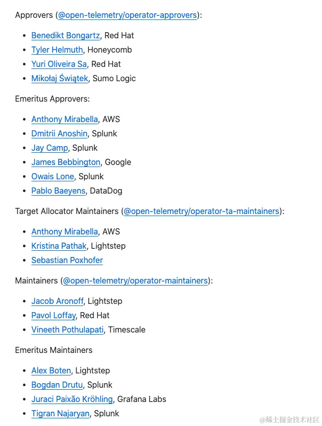 按照官方说法有着 1000 多位独立的开发者,代表了超过 180 家公司,在维护者的列表中也可以看到大多数都是来自于不同的公司: