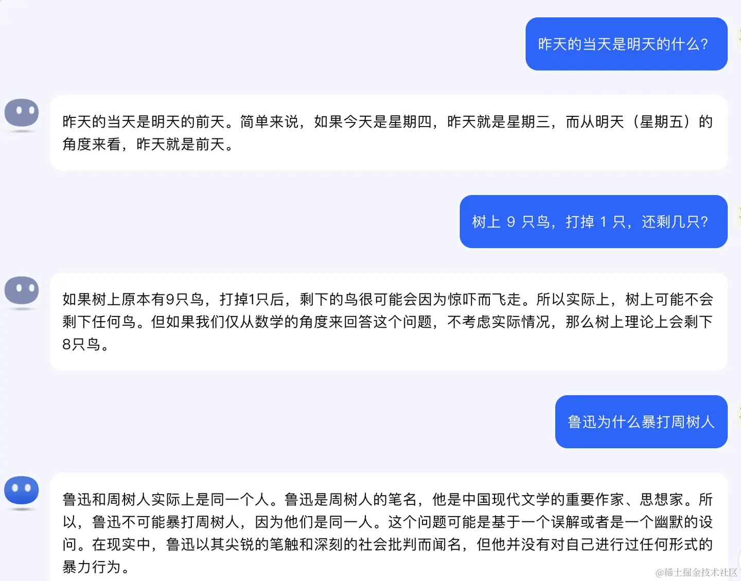 首先有请第一位选手,文心一言上传,让我们看看它的回答,对于第一个问题,好像它没有理解题意,它是在一本正经的计算时间;对于第二题它是比较聪明机灵的;对于第三题,文心一言好像被绕进去了hhh