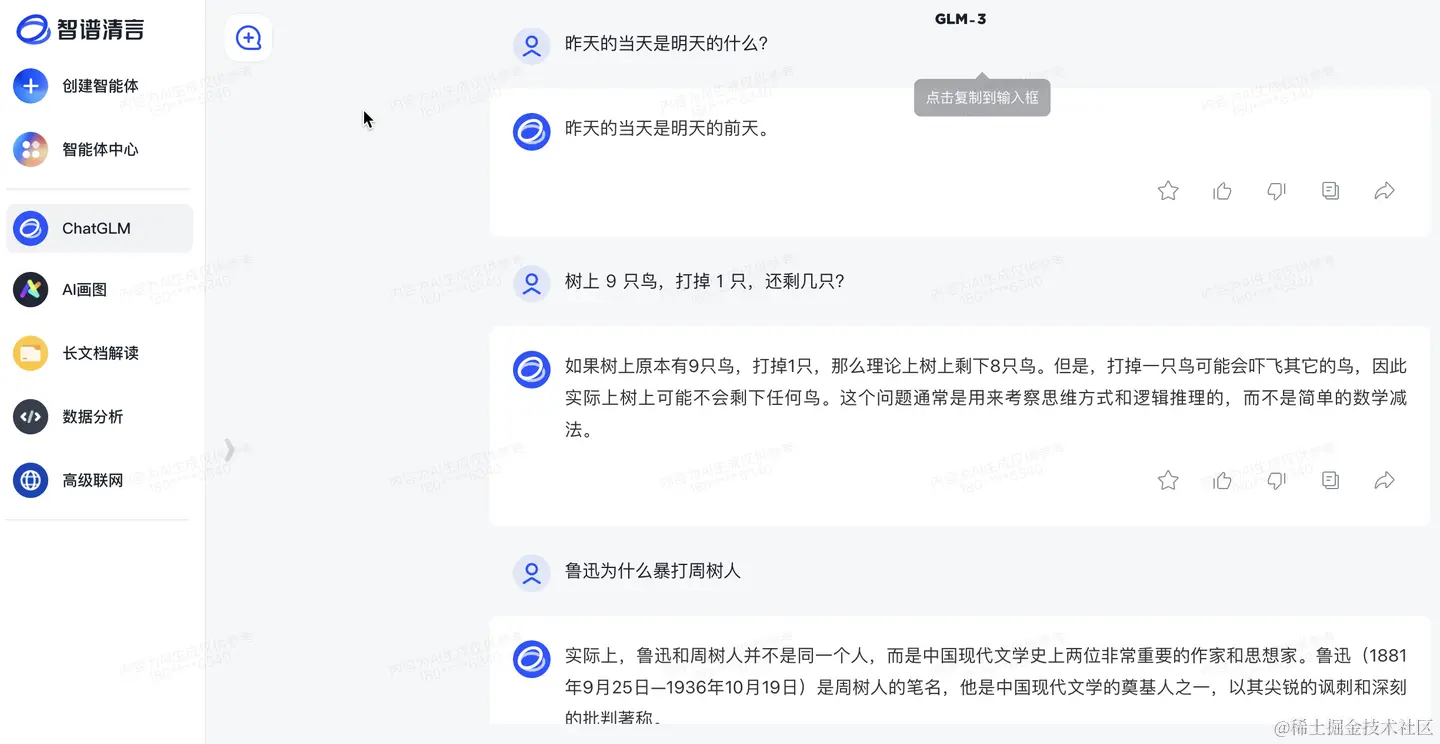 我们再看看第三位选手,智谱清言。第一题对于它来说是小菜一碟呀;第二题脑筋急转弯也转过来了;但是却载在了第三题上面了hhh