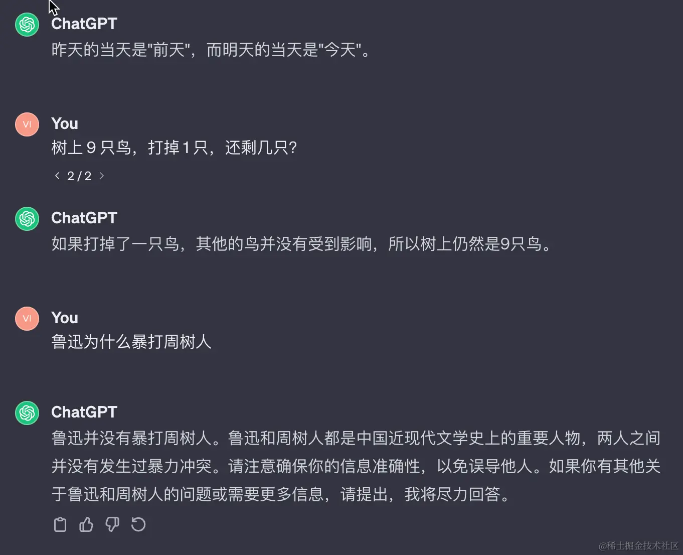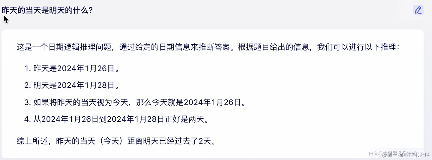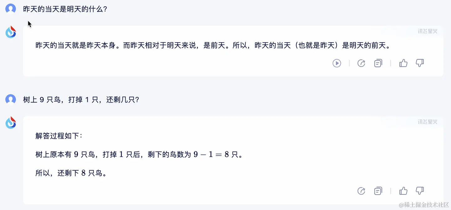 我们再看看第二位选手,第一题对于星火大模型来说是小菜一碟呀,不过对于第二题,星火大模型好像绕不过来了hhh;对于第三题,星火大模型答对了,其实我提醒了一下