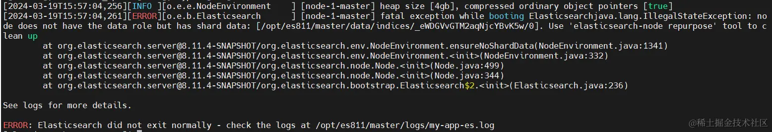 如果我修改了节点的角色,再次启动时就会报错。如下是从master、data等角色的一个实例修改为仅master节点的启动失败信息: