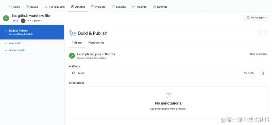 - 最后,在成功构建后,CI 作业将使用 actions/upload-artifact@v2 操作将我们的构建文件夹作为工件上传到 GitHub 上,保留时间为 7 天,以便 ci 作业可以在 docker-build 作业中下载相同的文件夹并用它来构建图像。在构建文件夹中,我们包括 .next 和 public 文件夹。 .next 文件夹是由构建过程生成的,我们使用公共文件夹来存放 svgs、图像等资源。因此我们也希望保留该文件夹。
