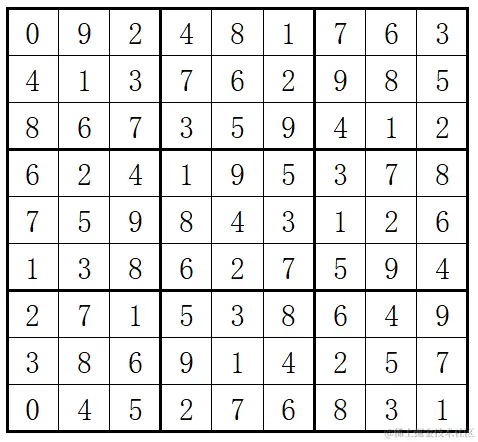 包含已知数字的9X9盘面数组[空缺位以数字0表示]
