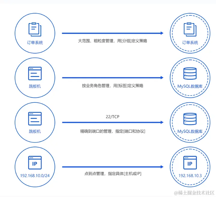 1、提供业务组、标签、端口、IP等不同粒度的策略管理。