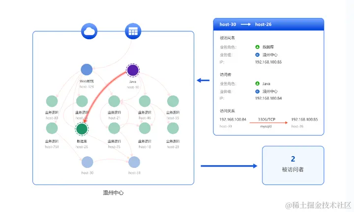 流量看得清——业务拓扑图可视化展示访问关系,自动学习业务访问关系,并以多种拓扑图清晰展示,结合资产信息,为策略制定提供基础。