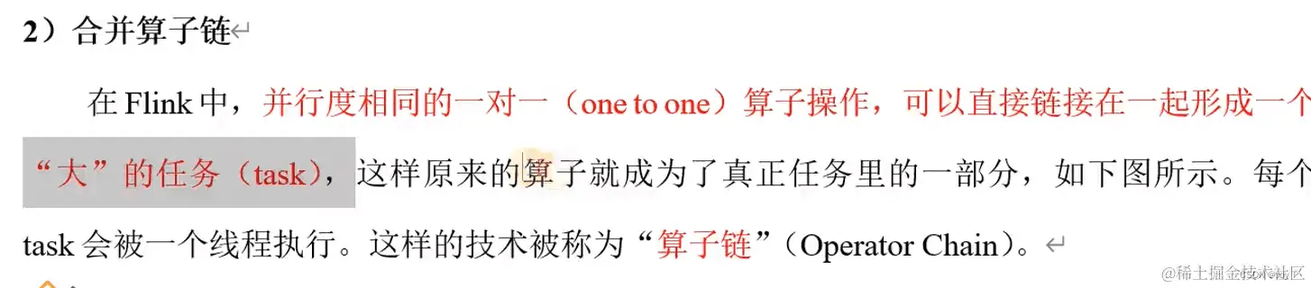 - 算子链(Operator Chaining)是 Flink 用来优化数据处理性能的一种技术。它允许将多个操作符(算子)合并成一个任务链,这样在执行过程中就可以减少数据在操作符之间的传输和序列化/反序列化开销。在 Flink 中,算子链默认是开启的,但可以通过配置进行调整;Spark采用了类似的优化机制,通常被称为“管道化”(pipelining)