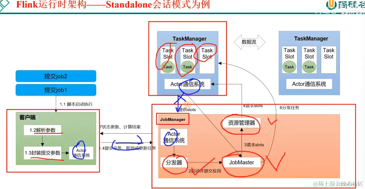 - 三大核心角色:Client JobManager TaskManager。一旦提交一个flink程序,本地就会启动一个Client进程,读取解析参数、封装提交参数,通过Actor通信系统提交给JobM。
