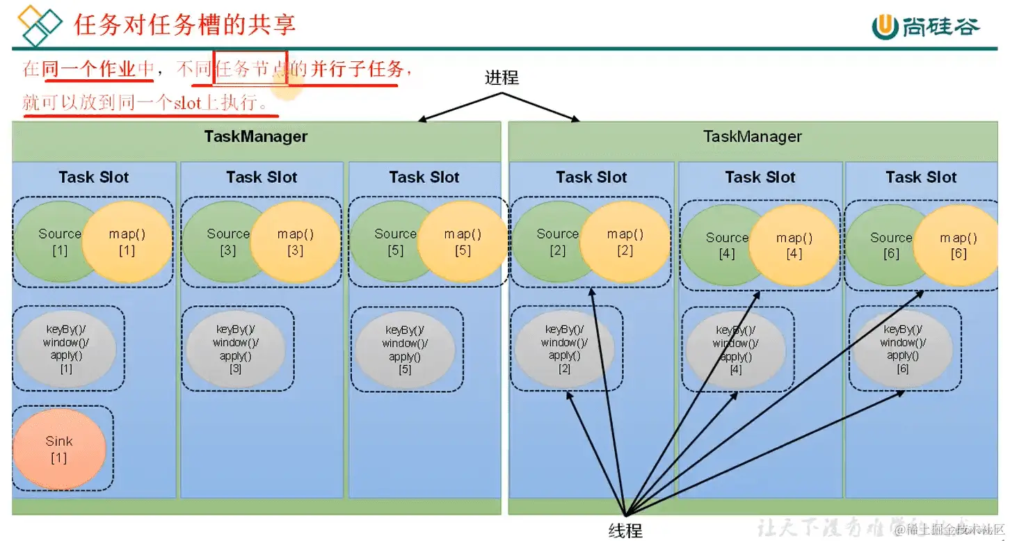 在一个 Flink 集群中,通常会有多个 TaskManager 实例,每个 TaskManager 可以运行在不同的机器上,故可以配置每个 TaskManager 的 Slot 数量为其所在机器的 CPU 核心数(每台机器通常运行一个 TaskManager 实例,和Hadoop的DataNode一样)