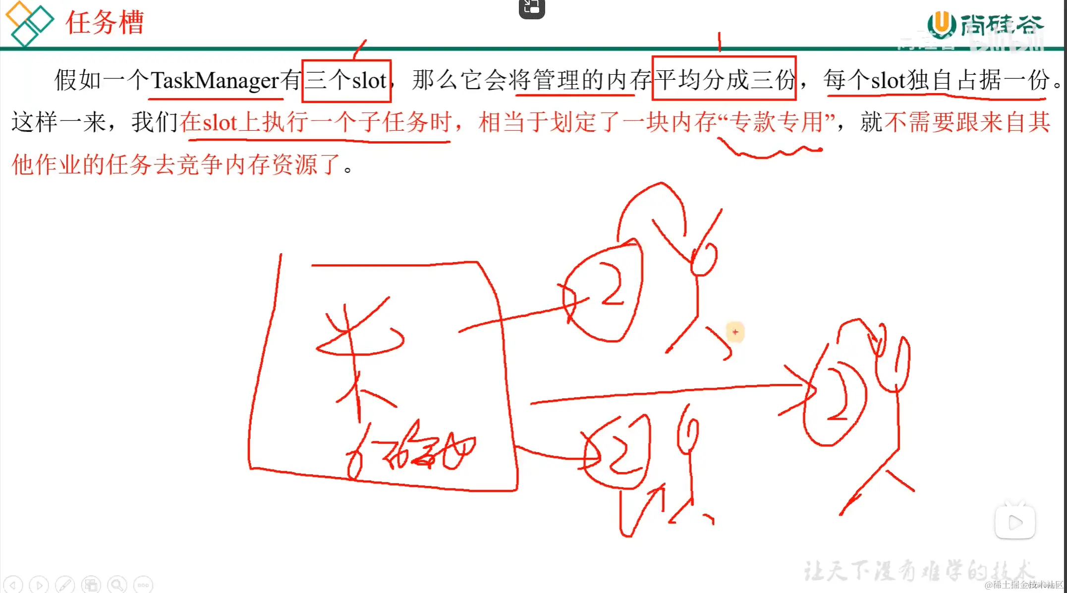 - 任务槽:在TaskManager小弟上固定给你两碗饭(内存资源,每个 Slot 能够运行一个并行实例的任务)!槽数最好和CPU核数保持一致,也是默认策略,防止TaskManager之间抢夺CPU资源。