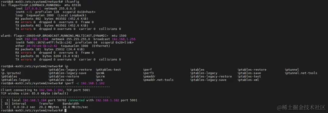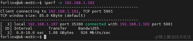 OK-MX9352-C开发板的两个网卡都是千兆,我们通过iperf工具来测试一下网速。这个工具的使用不是很简单,需要有一个服务器,这里在虚拟机里设置了服务器。