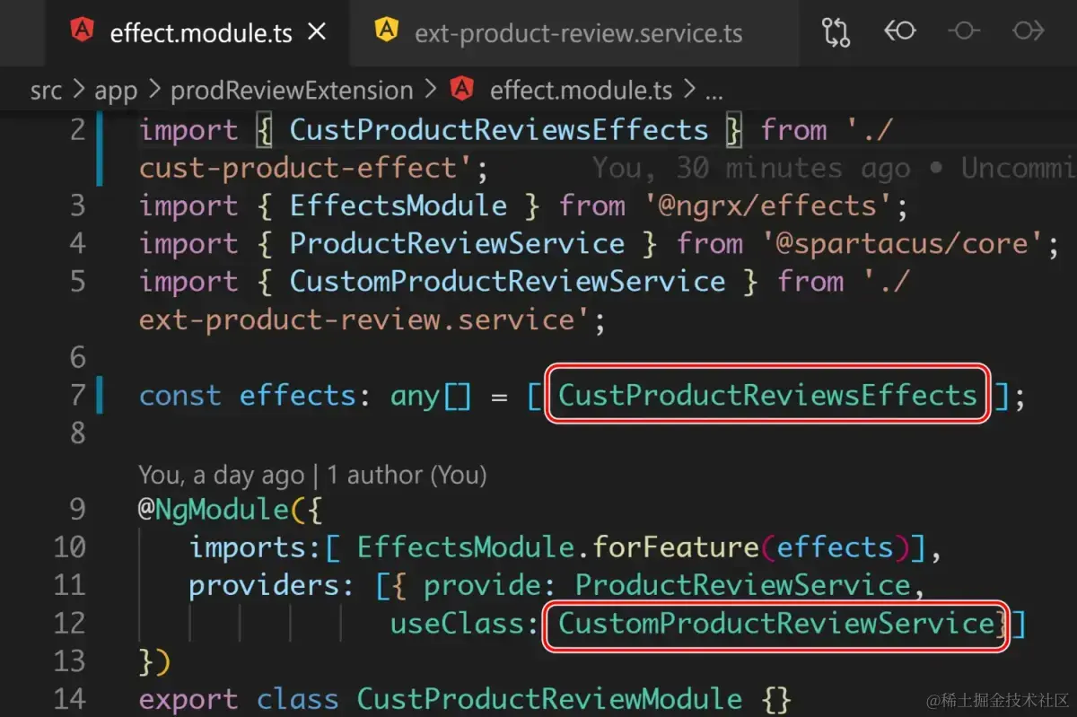 (4)将自定义的 Effect 和 Service 实现,通过 Angular 依赖注入框架,配置到对应的 Module 中。